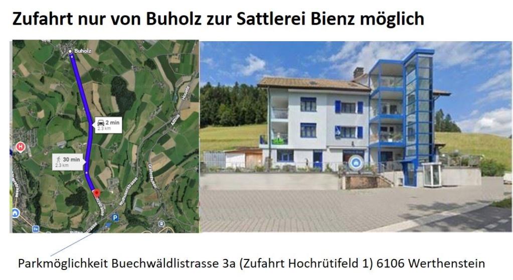Zufahrt nur von Buholz zur Sattlerei Bienz möglich