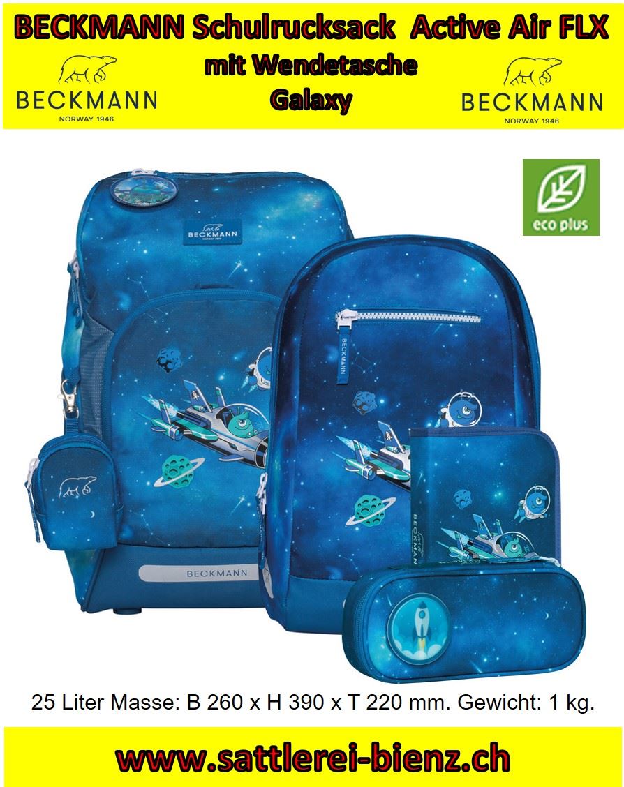 BECKMANN Galaxy Schulrucksack Active Air FLX mit Wendetasche 6teilig Set bestehend aus: 1 Schulrucksack (wie oben beschrieben), 1 Schüleretui B 133 x H 38 x T 195 mm, 2 Klappen, 20teilig gefüllt mit LYRA Produkten, 7 Farbstifte Jumbo, 7 Farbstifte, 2 Bleistifte Jumbo HB, Massstab 17 cm, Radierer, Doppelspitzer und Brieftasche, 1 Schlamperetui B 220 x H 100 x T 60 mm, 1 Sportrucksack Volumen 12 l, B 230 x H 360 x T 150 mm, 5 Kletties zum Auswechseln in praktischem Anhängebeutel und Regenhülle. UVP 259.00Fr