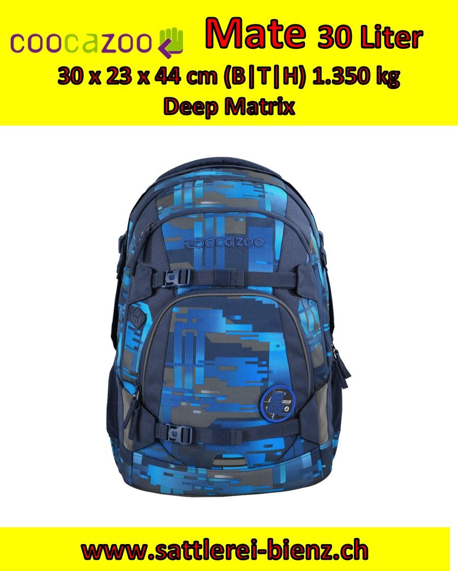 Coocazoo MATE Deep Matrix. Das kann der MATE: Mit einem Gewicht von 1.250 Gramm und 30 Litern Volumen ist der MATE der perfekte Allrounder für den Schulalltag. Mit dem EASY GROW SYSTEM wächst der MATE am Rücken deines Kindes mit und kann somit länger getragen werden. Hier erklären wir dir, wie's geht. Sein Innenleben ist in 4 unterschiedliche Fächer aufgeteilt; eines davon kann durch ein Tablet-/Laptop-Modul, für den digitalen Unterricht, erweitert werden.