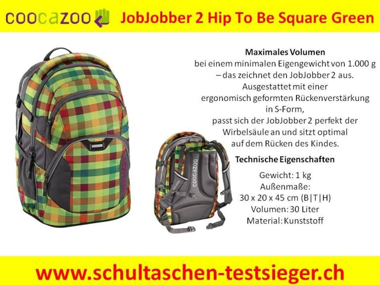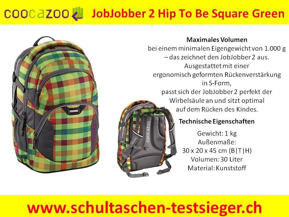 JobJobber2 Hip To Be Square Green Coocazoo Schulrucksack. Maximales Volumen bei einem minimalen Eigengewicht von 1.000 g ? das zeichnet den JobJobber 2 aus. Ausgestattet mit einer ergonomisch geformten Rückenverstärkung in S-Form, passt sich der JobJobber 2 perfekt der Wirbelsäule an und sitzt optimal auf dem Rücken des Kindes. Technische Eigenschaften Gewicht: 1 kg Außenmaße: 30 x 20 x 45 cm (B|T|H) Volumen: 30 Liter Material: Kunststoff