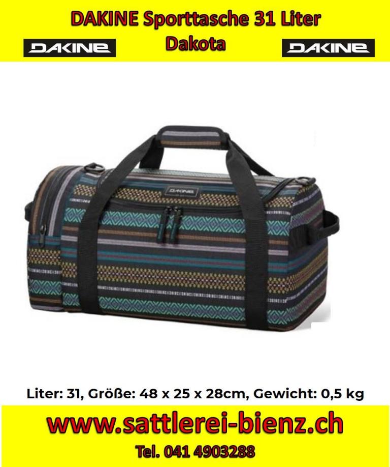 Dakine Dakota Sporttasche EQ 31 Liter EIGENSCHAFTEN U-förmige Öffnung zum leichten Zugriff Reißverschluss Endtasche Gepolsterte Schulterriemen Brillen Volume 1900 cu. in. [31 L] Größe 19 x 10 x 11 "[48 x 25 x 28cm] Gewicht 0,5 kg Materialien 600D Polyeste