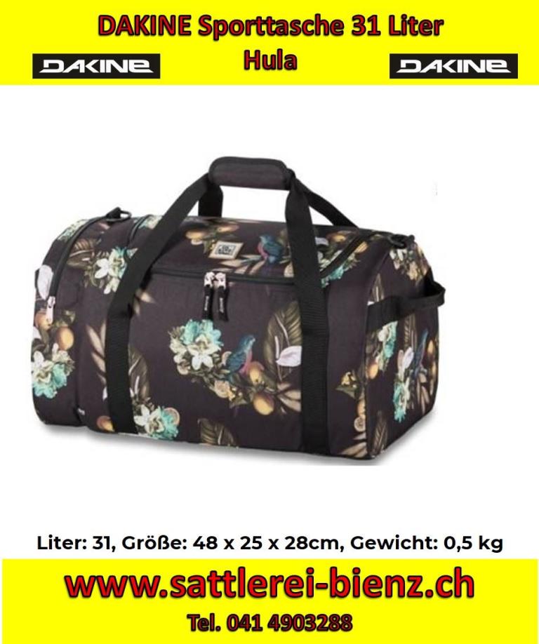 Dakine Hula Sporttasche EQ 31 Liter EIGENSCHAFTEN U-förmige Öffnung zum leichten Zugriff Reißverschluss Endtasche Gepolsterte Schulterriemen Brillen Volume 1900 cu. in. [31 L] Größe 19 x 10 x 11 "[48 x 25 x 28cm] Gewicht 0,5 kg Materialien 600D Polyeste