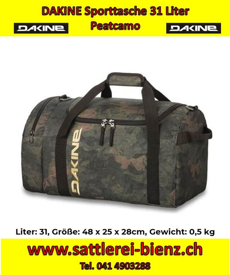 Dakine Peatcamo Bag Sporttasche EQ 31 Liter EIGENSCHAFTEN U-förmige Öffnung zum leichten Zugriff Reißverschluss Endtasche Gepolsterte Schulterriemen Brillen Volume 1900 cu. in. [31 L] Größe 19 x 10 x 11 "[48 x 25 x 28cm] Gewicht £ 1,1. [0,5 kg] Materialien 600D Polyeste