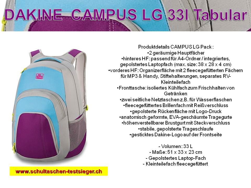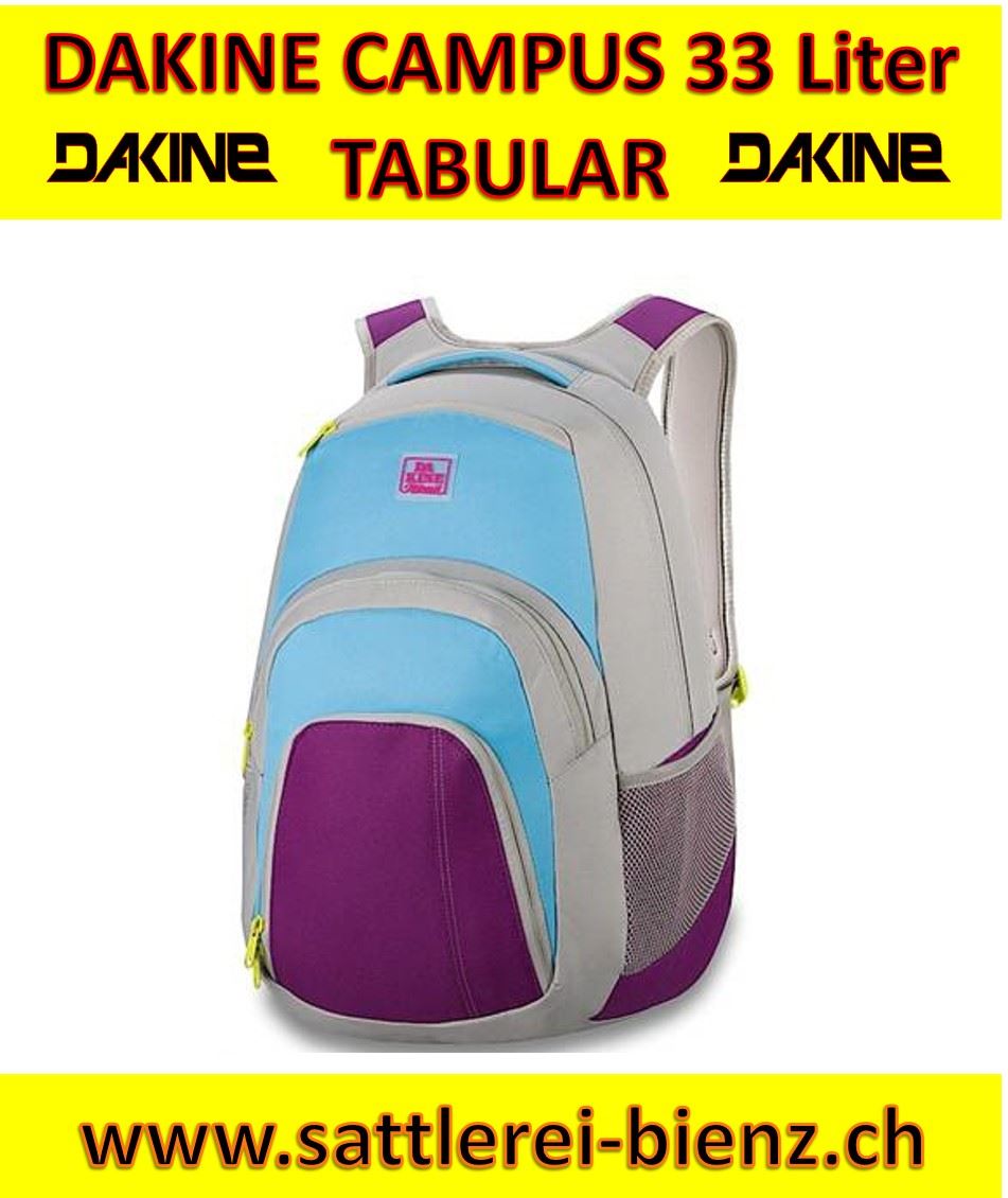 DAKINE CAMPUS LG 33l Tabular AUSSTATTUNG DES DAKINE CAMPUS LG RUCKSACK - gepolstertes Laptop Fach für 15" Laptops - Trageriemen in der Farbe des Rucksacks mit höhenverstellbarem Brustverschluss - isoliertes Kühlfach - organizer Fach - fleecegefüttertes Fach für Sonnenbrille TECHNISCHE DATEN - Volumen 33 Liter - Masse 51 x 33 x 23cm - Material 600D Polyester / 420D Nylon Dobby