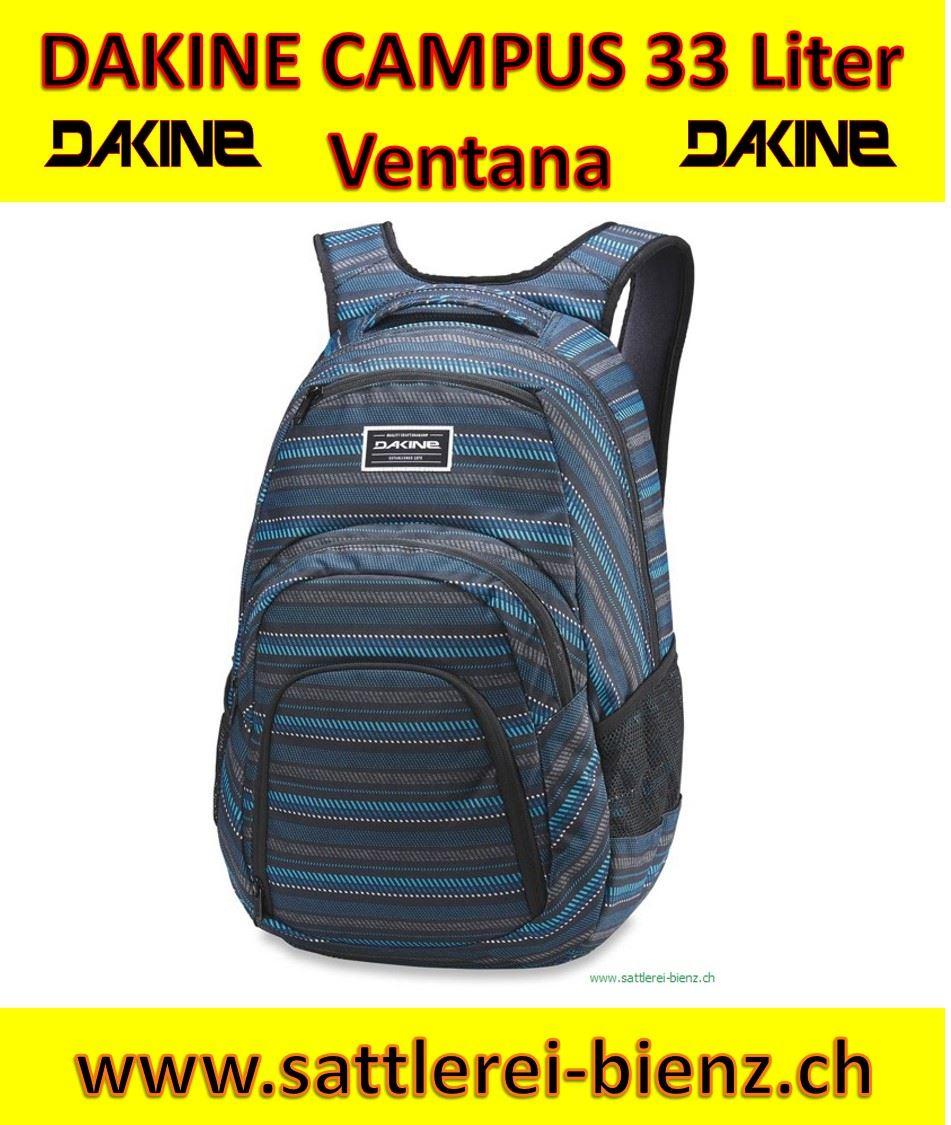 Dakine Campus Ventana 33L Backpack Rucksack 2 geräumige Hauptfächer hinteres HF: passend für A4-Ordner / integriertes, gepolstertes Laptopfach (max. size: 38 x 28 x 4 cm) vorderes HF: Organizerfläche mit 2 fleecegefütterten Fächern für MP3 & Handy, Stiftehalterungen, separates RV-Kleinteilefach Fronttasche: isoliertes Kühlfach zum Frischhalten von Getränken zwei seitliche Netztaschen z.B. für Wasserflaschen fleecegefüttertes Brillenfach mit Reißverschluss gepolsterte Rückenfläche mit Logo-Druck anatomisch geformte, EVA-geschäumte Tragegurte höhenverstellbarer Brustgurt mit Steckverschluss stabile, gepolsterte Trageschlaufe gesticktes Dakine-Logo auf der Frontseite - Volumen: 33 L - Maße: 51 x 33 x 23 cm - Gepolstertes Laptop-Fach - Kleinteilefach fleecegefüttert