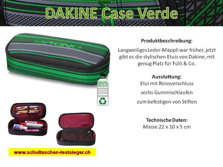 DAKINE Case Verde SCHOOL CASE Federmäppchen auf einen Blick: Maße zugeklappt (in cm): 22 x 10 x 5 Gewicht: 0,1 kg Material: 600D Polyester Produktdetails : äusserer durchgehender U-förmiger Reißverschluss aufklappbar in 2 Seiten Innenklappe mit 4 Schlaufen für Stifte genug Platz für ein Geo-Dreieck gesticktes Dakine-Logo auf dem Deckel