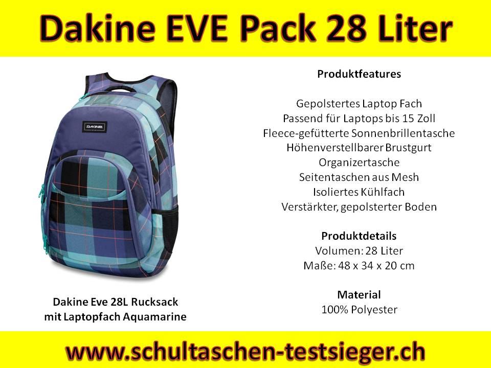 Dakine Eve Aquamarine 28L Rucksack mit Laptopfach DAKINE EVE RUCKSACK - organizer Fach mit Unterteilung für Handy, iPod und Schreibutensilien - gepolstertes Fach für den Laptop bis max. 15" oder 36.5 x 27.5 x 4 cm - isoliertes Kühlfach für Getränke - Mesh Seitentaschen - Fleece gefüttertes Sonnenbrillenfach - verstellbarer Brustverschluss TECHNISCHE DATEN - Volumen 28 Liter - Masse 48 x 34 x 20 cm - max. Laptop Grösse 15" oder 36.5 x 27.5 x 4