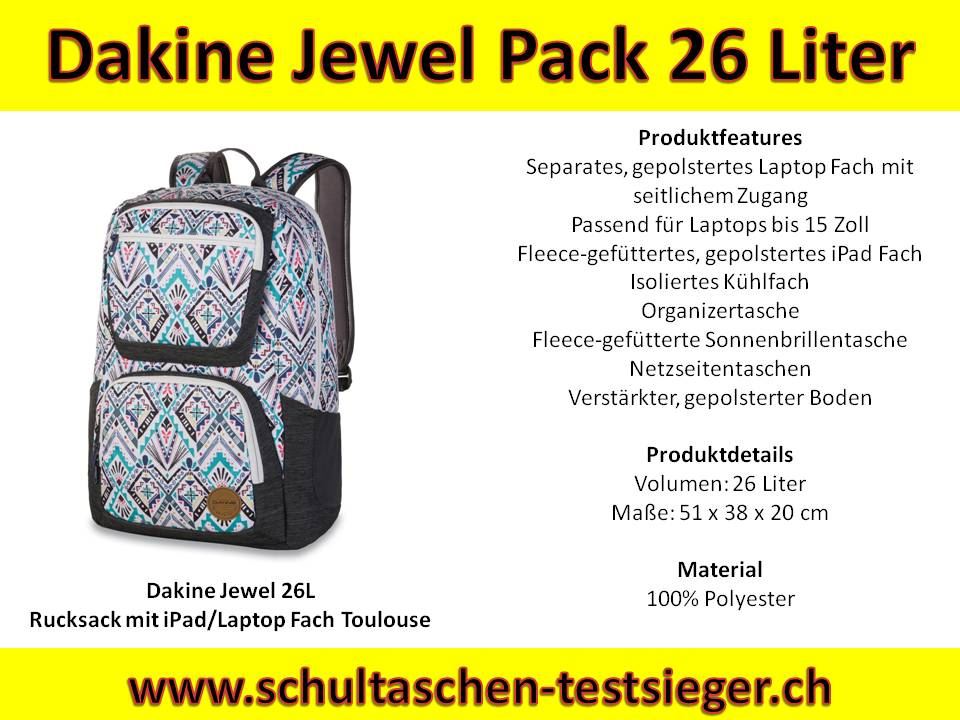 Dakine Jewel Toulouse 26L Rucksak AUSSTATTUNG DES DAKINE JEWEL RUCKSACK Separates, gepolstertes Laptop Fach mit seitlichem Zugang Passend für Laptops bis 15 Zoll Fleece-gefüttertes, gepolstertes iPad FachIsoliertes Kühlfach Organizertasche Fleece-gefütterte Sonnenbrillentasche Netzseitentaschen Verstärkter, gepolsterter Boden Produktdetails Volumen: 26 Liter Maße: 51 x 38 x 20 cm Material: 100% Polyester