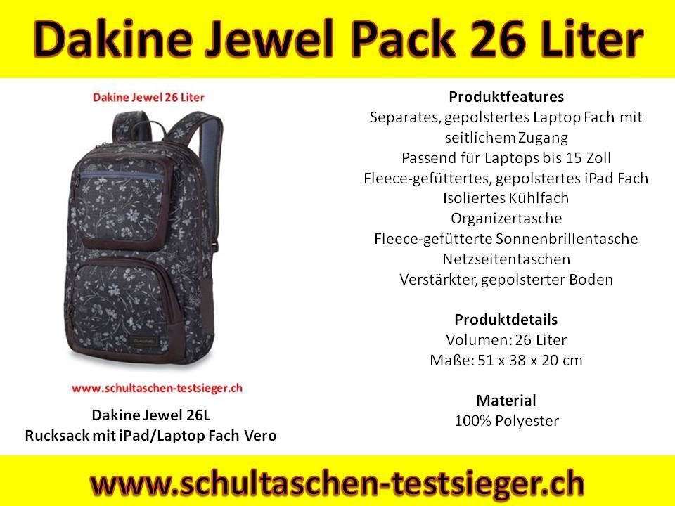 Dakine Jewel Vero 26L Rucksack mit iPad u. Laptop Fach mit iPad u. Laptop Fach Der Dakine Jewel 26L Schul- / Streetrucksack für coole Girls und Mädchen besticht durch seine funktionelle Ausstattung, die ergonomische Passform und das modische Design. So verfügt der Dakine Jewel Tornister über ein großes Hauptfach und ein separates, gepolstertes Laptopfach (max. 15 Zoll) mit Reißverschluss und praktischem Seitenzugang. Zudem ist im Multimedia Rucksack ein gepolstertes und fleece-gefüttertes iPad Sleeve integriert, so bleiben Tablet und Laptop kratzerfrei und sind beim Transport optimal vor Stößen und Erschütterungen geschützt. Als funktionelle Details des Dakine Jewel Rucksacks sind für Schule und Freizeit sind auch das übersichtliche Organizerfach, das fleece-gefütterte Sonnenbrillenfach und das praktische Kühlfach für frische Pausen Snacks hervorzuheben. Zwei dehnbare Seitenfächer aus Mesh bieten dir darüber hinaus Platz für das Getränk unterwegs. Für den optimalen Sitz des Dakine Jewel Schulrucksacks für Mädchen sorgen seine ergonomisch geformten Tragegurte und ein verstellbarer Brustgurt.