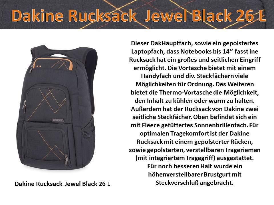 Dakine Rucksack Jewel Black 26 L Dieser Dakine Rucksack hat ein großes Hauptfach, sowie ein gepolstertes Laptopfach, dass Notebooks bis 14 fasst und seitlichen Eingriff ermöglicht. Die Vortasche bietet mit einem Handyfach und div. Steckfächern viele Möglichkeiten für Ordnung. Des Weiteren bietet die Thermo-Vortasche die Möglichkeit, den Inhalt zu kühlen oder warm zu halten. Außerdem hat der Rucksack von Dakine zwei seitliche Steckfächer. Oben befindet sich ein mit Fleece gefüttertes Sonnenbrillenfach. Für optimalen Tragekomfort ist der Dakine Rucksack mit einem gepolsterter Rücken, sowie gepolsterten, verstellbaren Trageriemen (mit integriertem Tragegriff) ausgestattet. Für noch besseren Halt wurde ein höhenverstellbarer Brustgurt mit Steckverschluß angebracht.
