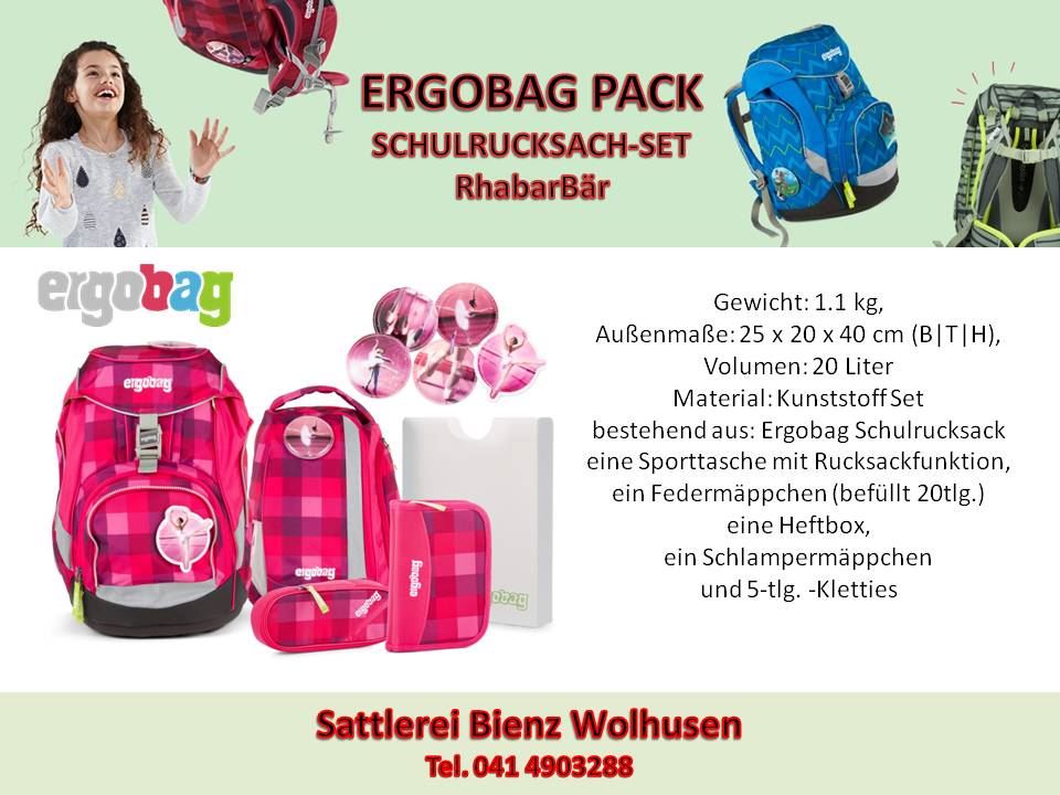 Ergobag Schulrucksack-Set Pack 6-tlg RhabarBär ergobag 6-tlg. Set Gewicht: 1.1 kg, Außenmaße: 25 x 20 x 40 cm (B|T|H), Volumen: 20 Liter Material: Kunststoff Set bestehend aus: Ergobag Schulrucksack ein Sporttasche mit Rucksackfunktion, ein Federmäppchen (befüllt 20tlg.), eine Heftbox, ein Schlampermäppchen und 5-tlg.