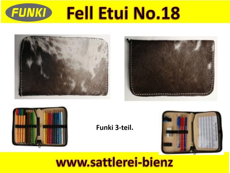 No.18 Funki Fell Schüler Etui 195 x 130 x 30 mm, geschlossen 1 Mittelteil, Lederlaschen Metallreissverschluss 14 CdA Farbstifte, 3 CdA Bleistifte 4 Stabilo 88, Stundenplan etc Gewicht ca. 0,400 Kg