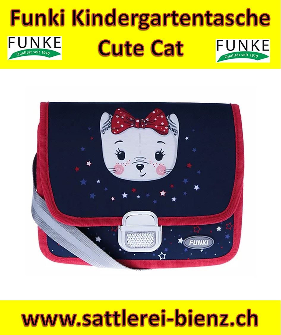 Funke Cute Cat Kindergarten-Tasche Funki. Der Klassiker für den Kindergarten wurde neu überarbeitet. Als absolutes Highlight wurde die Kindergarten-Tasche mit einem reflektierenden und längenverstellbaren Tragegurt ausgestattet. Dieser sorgt zusammen mit der robusten Metallschnalle mit Reflektor für die nötige Sicherheit im Strassenverkehr - der ultimative Fussgänger-Bodyguard also.