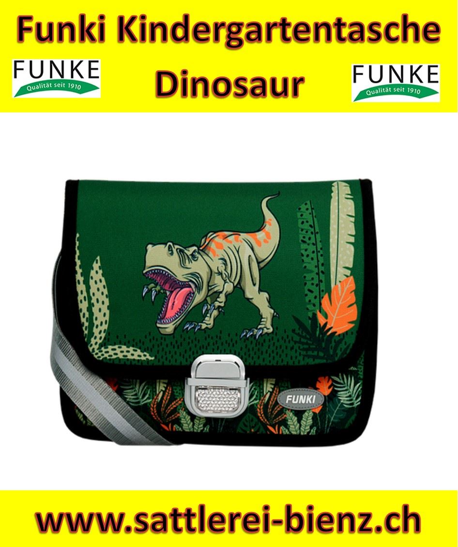 Funke Dinosaur Kindergarten-Tasche Funki. Der Klassiker für den Kindergarten wurde neu überarbeitet. Als absolutes Highlight wurde die Kindergarten-Tasche mit einem reflektierenden und längenverstellbaren Tragegurt ausgestattet. Dieser sorgt zusammen mit der robusten Metallschnalle mit Reflektor für die nötige Sicherheit im Strassenverkehr - der ultimative Fussgänger-Bodyguard also.