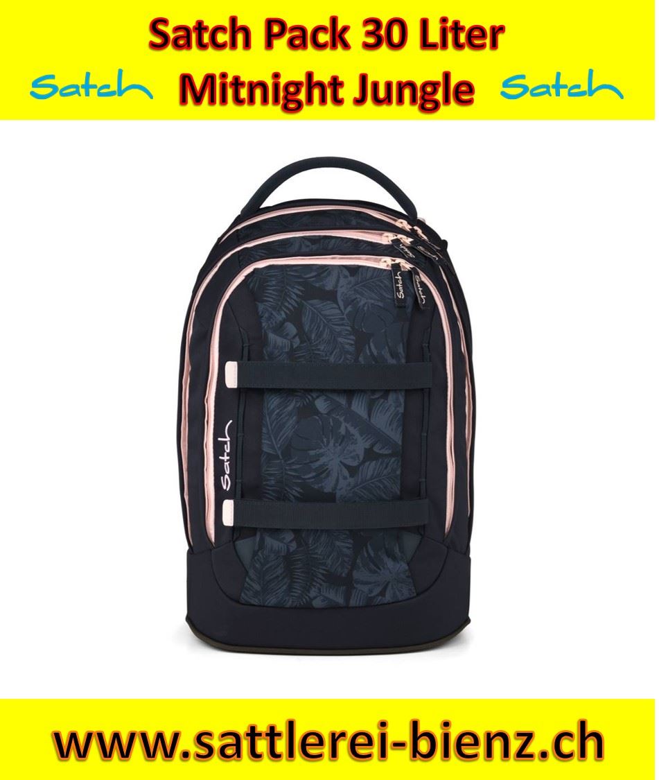 satch Pack Mitnigth Jungle Schulrucksack 30 Liter Maße ca.: 30x22x45cm, Hochwertige Lederapplikationen Volumen ca. 30l, Gewicht ca. 1,2 kg Material: recycled PET Herstellergarantie: 2 Jahr. UVP 169.00Fr.