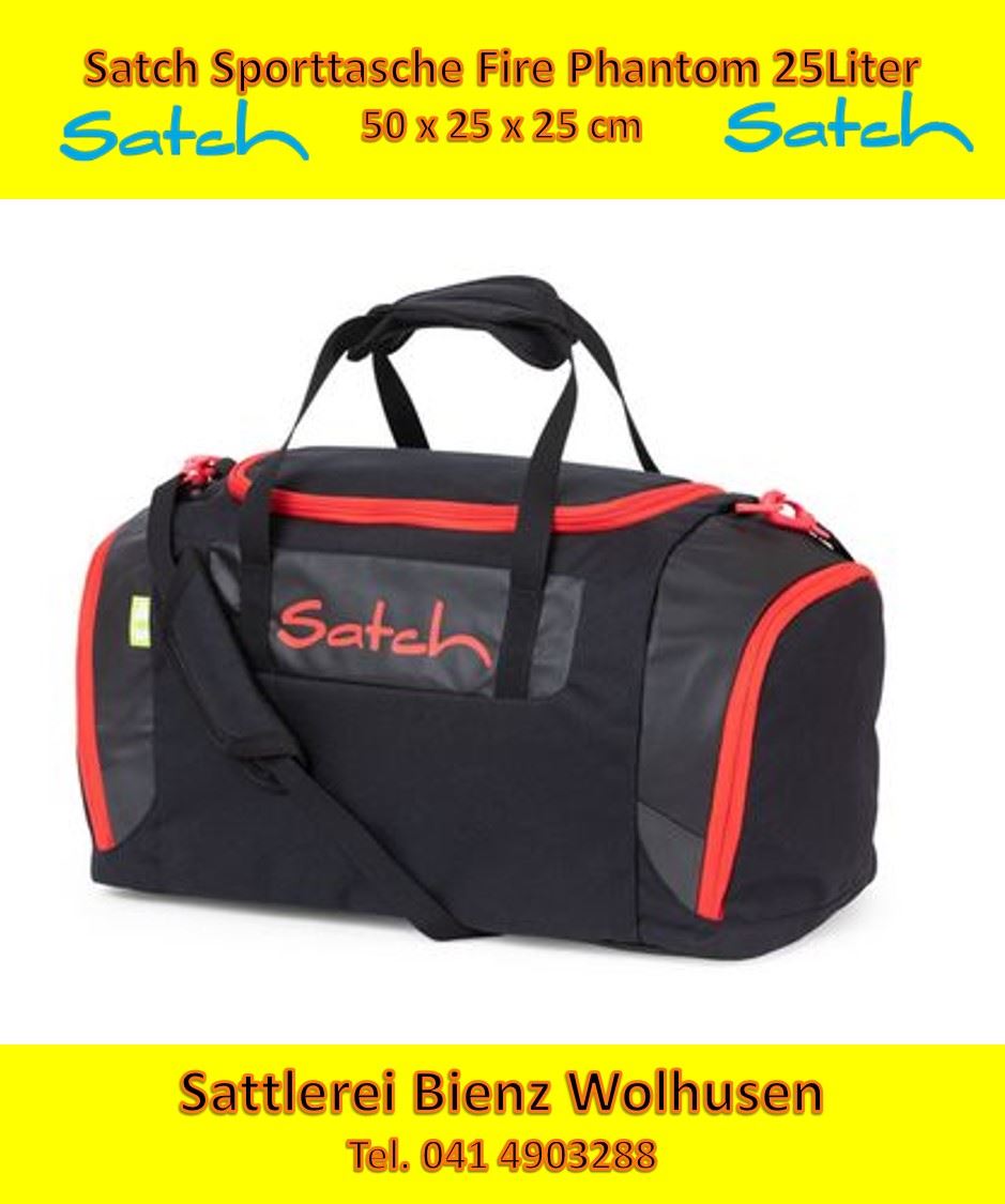 Satch Fire Phantom Sporttasche. Die Turntasche mit Nassfach hat ein großes Hauptfach, zwei Seitentaschen und eine Reißverschluss-Vortasche. Die Satch Sporttasche kann entweder mit dem gepolsterten Schultergurt oder mit den mittleren zwei Schlaufen getragen werden. Masse: 45 x 25 x 25 cm 25 Liter