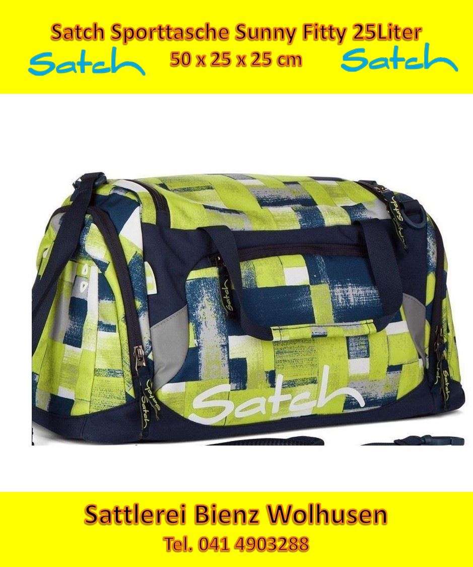Satch Sunny Fitty Sporttasche. Die Turntasche mit Nassfach hat ein großes Hauptfach, zwei Seitentaschen und eine Reißverschluss-Vortasche. Die Satch Sporttasche kann entweder mit dem gepolsterten Schultergurt oder mit den mittleren zwei Schlaufen getragen werden. Masse: 45 x 25 x 25 cm 25 Liter