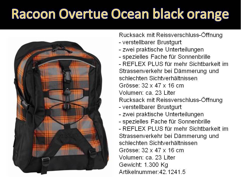 Racoon Overtue Ocean black orange mit Reissverschluss-Öffnung - verstellbarer Brustgurt - zwei praktische Unterteilungen - spezielles Fache für Sonnenbrille - REFLEX PLUS für mehr Sichtbarkeit im Strassenverkehr bei Dämmerung und schlechten Sichtverhältnissen Grösse: 32 x 47 x 16 cm Volumen: ca. 23 Liter Gewicht: 1.300 Kg