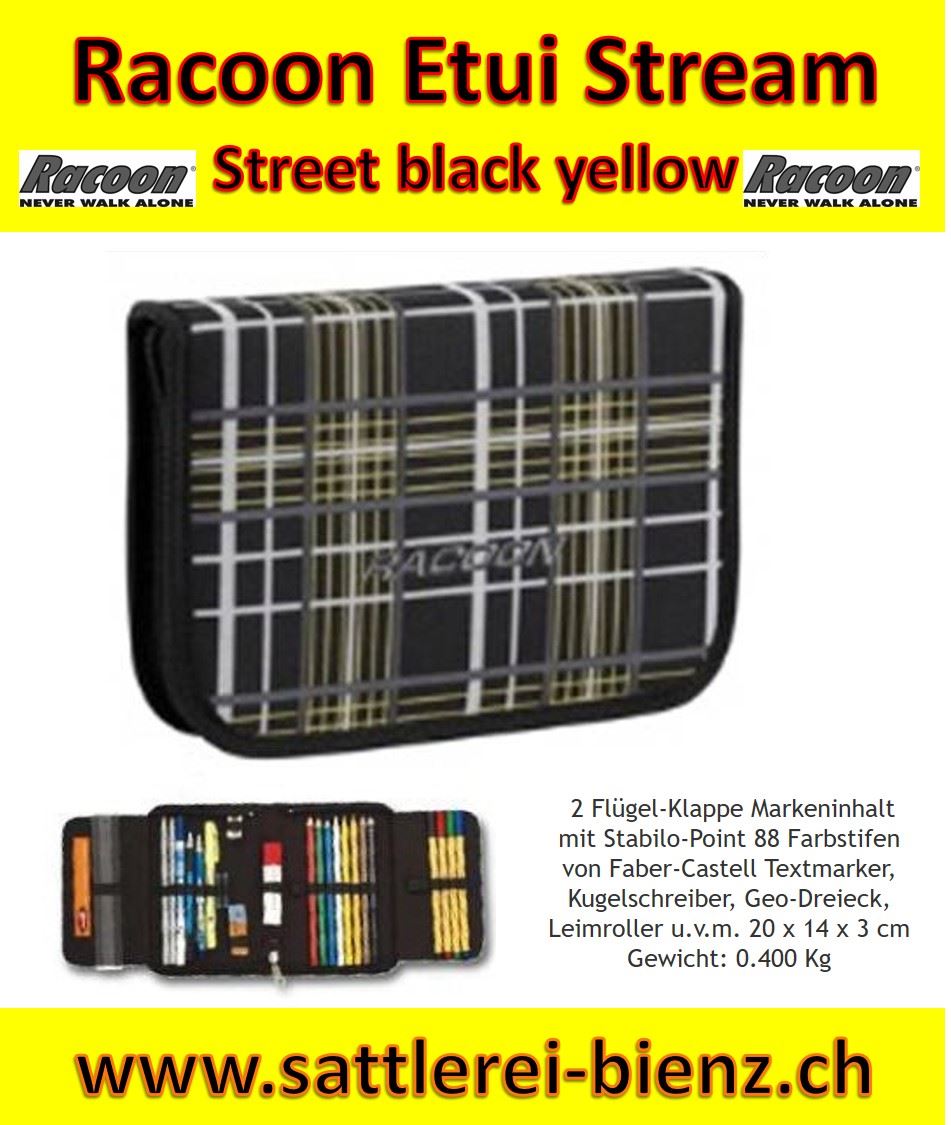 RACOON Schüleretuis Stream Street black yellow RACOON Schüleretuis Stream Street 2 Klappen, Namensschild, Farbstifte und Bleistift Faber Castell Grip, Faserschreiber Stabilo Point 88, Fine-Bleistift 0,5 mm, Kugelschreiber, Textmarker, Geo-Dreieck mit Lineal, Kern Zirkel, Radiergummi, Leim, Metall-Bleistiftspitzer. Masse: B 200 x H 140 x T 30 mm.