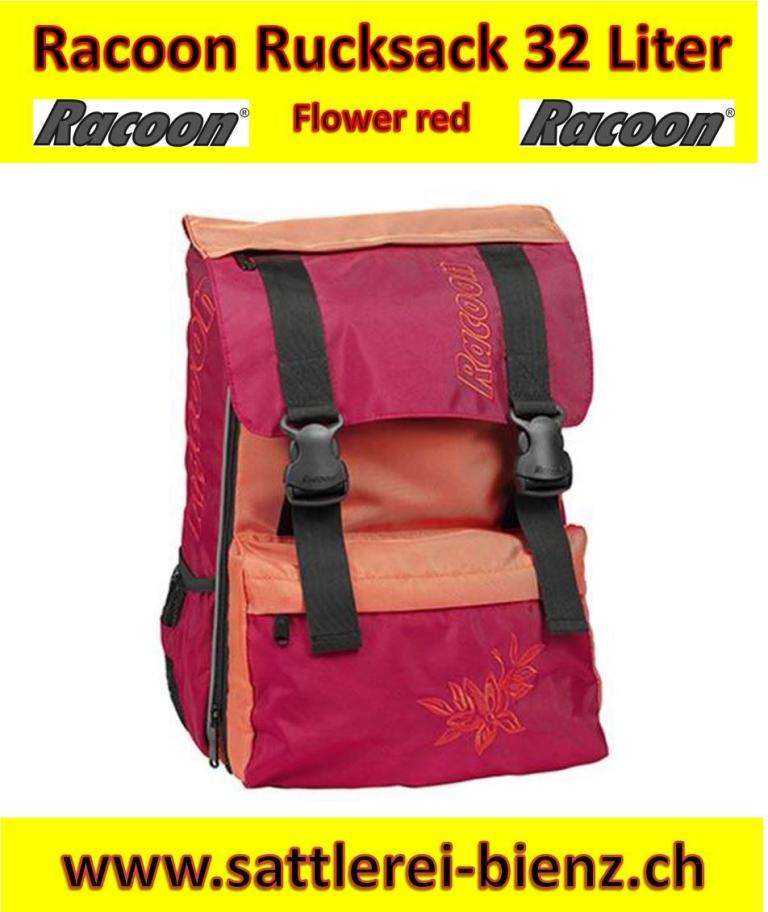 Racoon Rucksack FLOWER redk Rucksack mit Klappe und Steckverschluss REFLEX PLUS für mehr Sichtbarkeit bei schlechten Sichtverhältnissen . - seitliche Aussenfächer - vergrösserbar für mehr Platzvolumen - gepolstertes Innenfach - Sicherheitsfach (innen) - Hüft- und Brustgurt - Schnalle für den Velohelm . Grösse: 30 x 44 x 15 cm (+ 10 cm) Volumen: ca. 32 Liter Gewicht: 1.300 Kg Sofort lieferbar!!!!