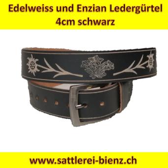 Ledergürtel 4cm mit Enzian und Edelweiss schwarz-150 cm Länge