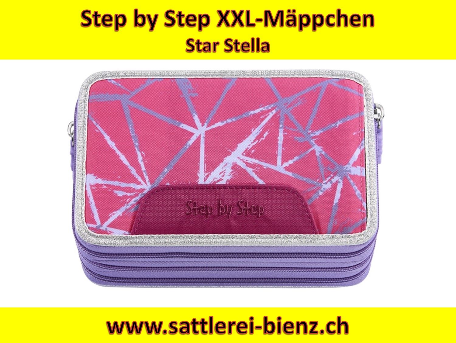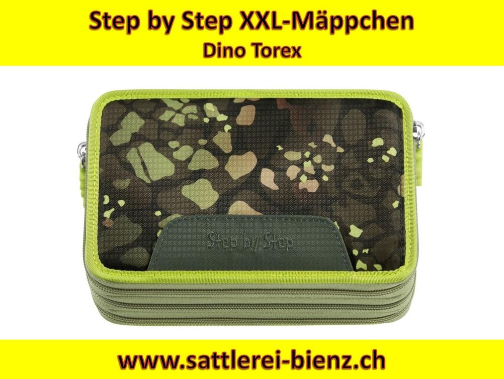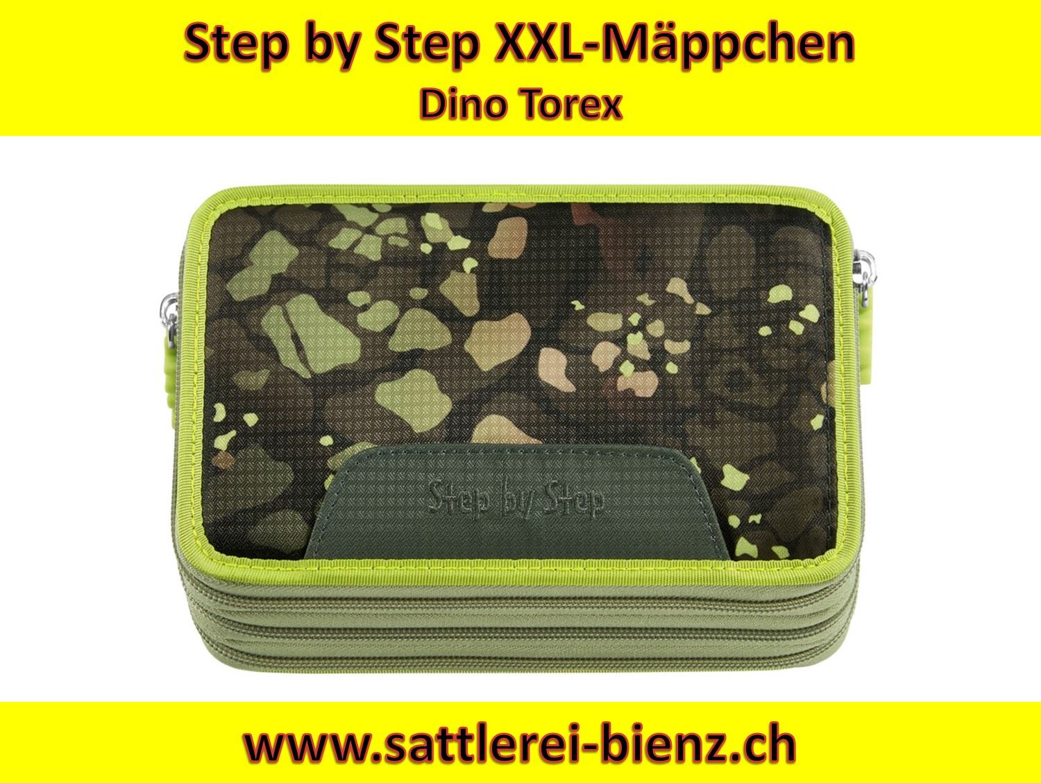 Step by Step Dino Torex XXL-Mäppchen3 Fächer komplett bestückt mit Markenstiften Bestückung: 16 Tri Color-Farbstifte 2 Farbstifte (Gold und Silber) 1 Jumbo Bleistift 1 dünner Bleistift 18 Farb-Filzstifte 1 Plastik-Lineal, 15cm 1 Schere 1 Uhu-Klebestick 1 Doppelspitzer 1 Radiergummi