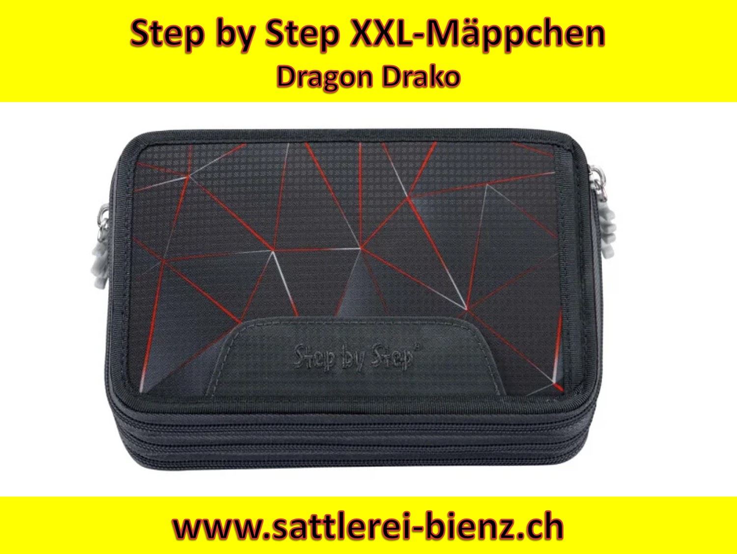Step by Step Dragon Drako XXL-Mäppchen", 3 Fächer komplett bestückt mit Markenstiften Bestückung: 16 Tri Color-Farbstifte 2 Farbstifte (Gold und Silber) 1 Jumbo Bleistift 1 dünner Bleistift 18 Farb-Filzstifte 1 Plastik-Lineal, 15cm 1 Schere 1 Uhu-Klebestick 1 Doppelspitzer 1 Radiergummi