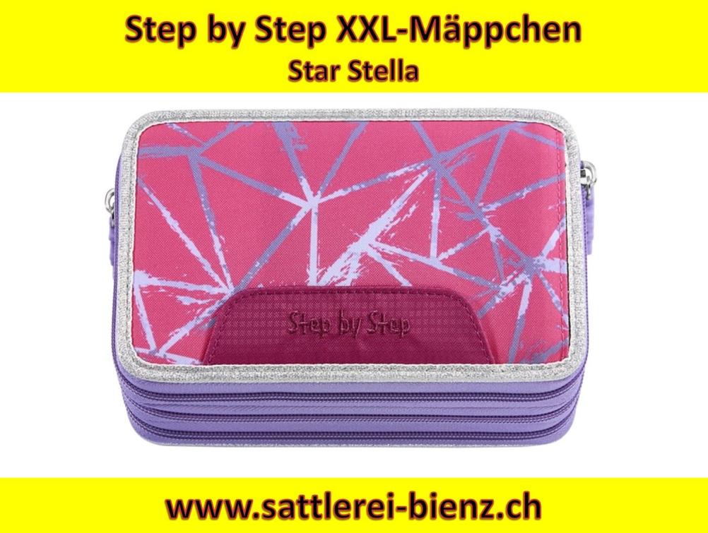 Step by Step Star Stella XXL-MäppchenFächer komplett bestückt mit Markenstiften Bestückung: 16 Tri Color-Farbstifte 2 Farbstifte (Gold und Silber) 1 Jumbo Bleistift 1 dünner Bleistift 18 Farb-Filzstifte 1 Plastik-Lineal, 15cm 1 Schere 1 Uhu-Klebestick 1 Doppelspitzer 1 Radiergummi