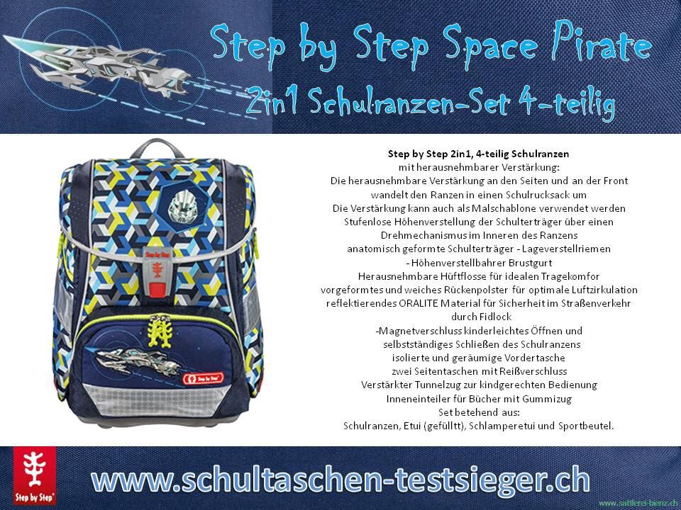 Step by Step 2in1 Space Pirate Limitierte Edition Step by Step 2in1, 4-teilig Schulranzen mit herausnehmbarer Verstärkung: Die herausnehmbare Verstärkung an den Seiten und an der Front wandelt den Ranzen in einen Schulrucksack um Set betehend aus: Schulranzen, Etui (gefülltt), Schlamperetui und Sportbeutel. Gewicht: ca. 1.180 g* *zzgl. Verstärkung 100g, ** Volumen Gesamt: ca. 19,0 l Volumen Hauptfach: ca. 15,0 l Volumen Außentaschen: ca. 4,0 l Maße: Breite x Tiefe x Höhe 29,0 x 21,0 x 37,5 cm UVP: 269.00