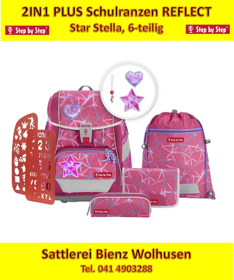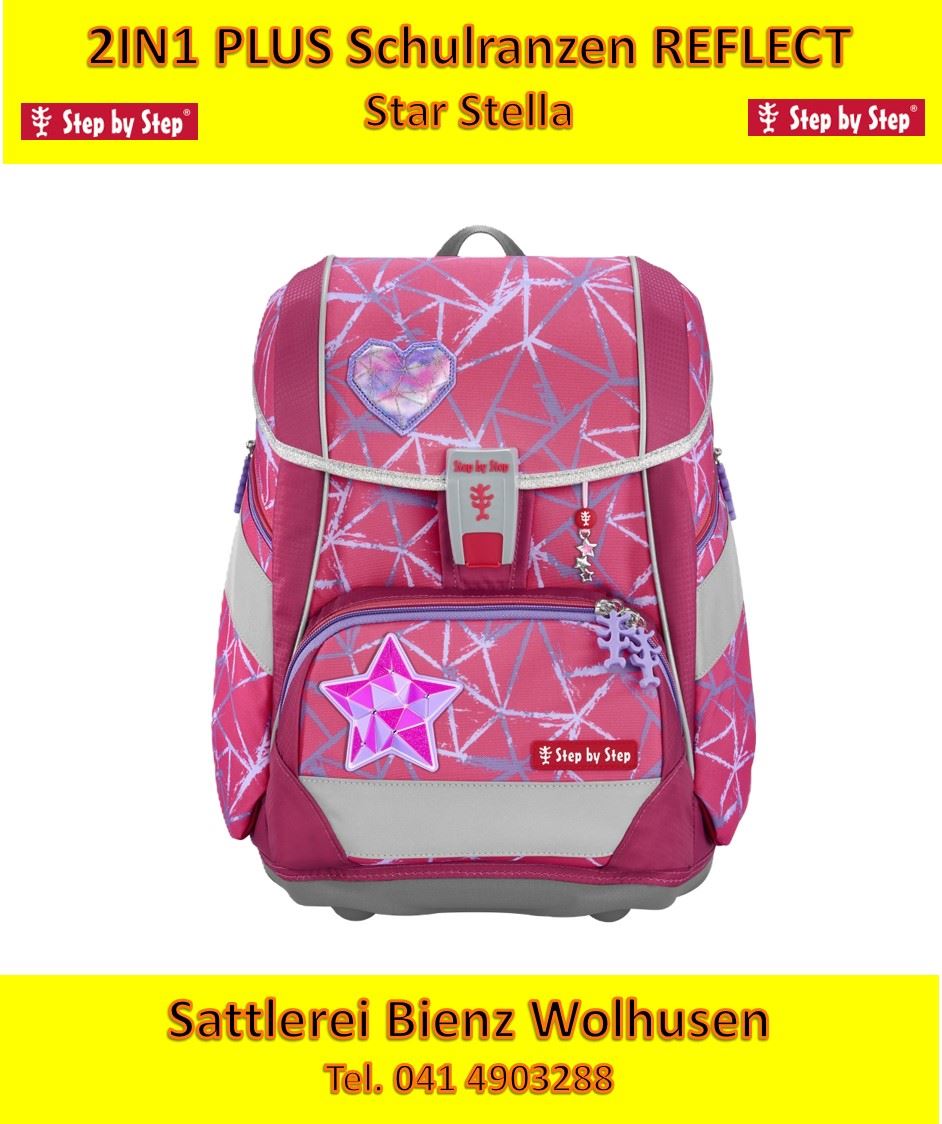 Step by Step 2IN1 PLUS Schulranzen Star Stella, 6-teilig. Reflect 2IN1 PLUS. Inhalt des Sets: Schulranzen, Federmäppchen, Schlampermäppchen, Sportbeutel, Schablonen und MAGIC MAGS Gewicht: 1,2 Kg, Masse: 28 x 37,5 x 20 cm Volumen :19 Litern Seitentaschen A4 Ordner kompatibel Bücherfach, Vortasche Höhenverstellbares, Tragesystem, Brustgurt, Hüftgurt von \Aktion Gesunder Rücken e. V. (AGR)\" ausgezeichnet UVP 299.00 Fr.