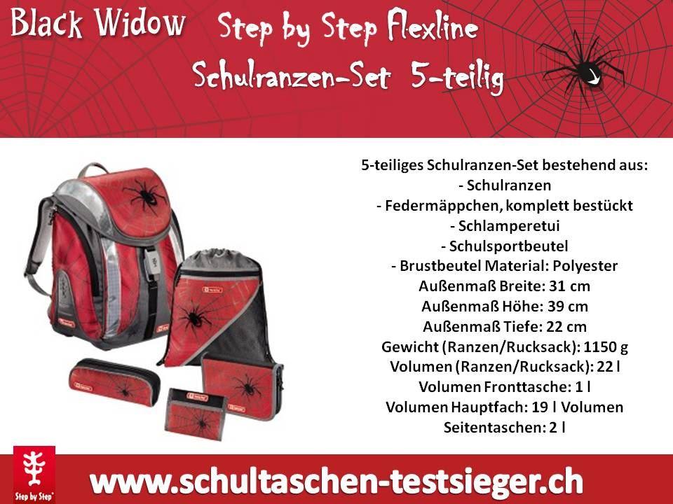 Step by Step Flexline Schulranzen-Set Black Widow - zur Beförderung von Schulutensilien vom Stift bis zum Sportzeug 5-teiliges Schulranzen-Set bestehend aus: - Schulranzen - Federmäppchen, komplett bestückt - Schlamperetui - Schulsportbeutel - Brustbeutel Schulranzen in Rucksackoptik: - Easy Adjust System: stufenlose Höhenverstellung der Schulterträger - anatomisch geformte Schulterträger in S-Form - Hüftflosse mit Beckengurt für idealen Tragekomfort, komplett im Rückenteil verstaubar - weiches Rückenpolster mit Rillen für optimale Luftzirkulation - durch Magnetverschluss (Snap Push) kinderleichtes Öffnen und selbstständiges Schließen des Schulranzenes - geräumige Vordertasche - zwei Seitentaschen, Tragegriff/Aufhängeschlaufe - Stundenplan im Deckel - Karabiner für Schlüssel und kleine Reißverschlusstaschen innen - flexibler Inneneinteiler mit Gummizug - reflektierendes REFLEXITE Material für Sicherheit im Straßenverkehr Unverbindlich empfohlener Verkaufspreis: CHF 249.00