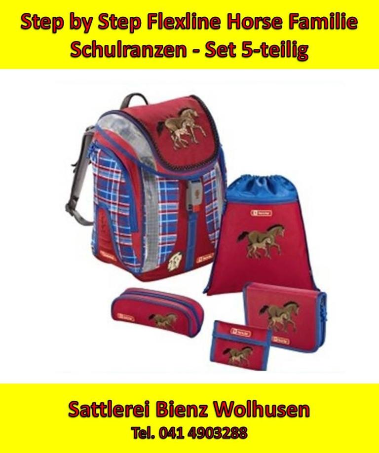 Step by Step Horse Famile Flexline Schulranzen-Set 5-teilig Set bestehend aus: •Schulranzen Flexline, •Federmäppchen, bestückt, •Schlamperetui, •Brustbeutel, •Schulsportbeutel Innenausstattung Schulranzen: •geräumiges Hauptfach mit, •Inneneinteiler, flexible,zweigeteilt im hinteren Bereich des Hauptfaches positioniert den Inhalt des Schulranzens ergonomisch vorteilhaft dicht am Rücken
