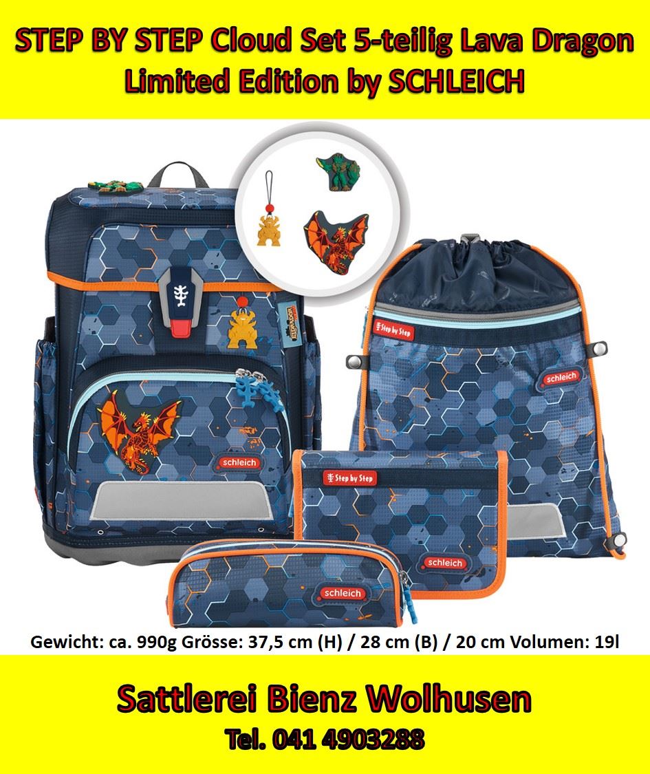 STEP BY STEP Schulrucksack-Set Cloud 5teilig Limited Edition by SCHLEICH Inhalt des Sets: Schulranzen, Federmäppchen, Schlamperetui, Sportbeutel und MAGIC MAGS Gewicht: ca. 990g Größe: 37,5 cm (H) / 28 cm (B) / 20 cm (T)Gesamtvolumen: 19l (Hauptfach: 15l, Seitentaschen: 3l, Fronttasche: 1l) Material: Rippstopp Nylon 100% PFC-freier Textilien zu 100% aus recycelten PET-Flaschen.